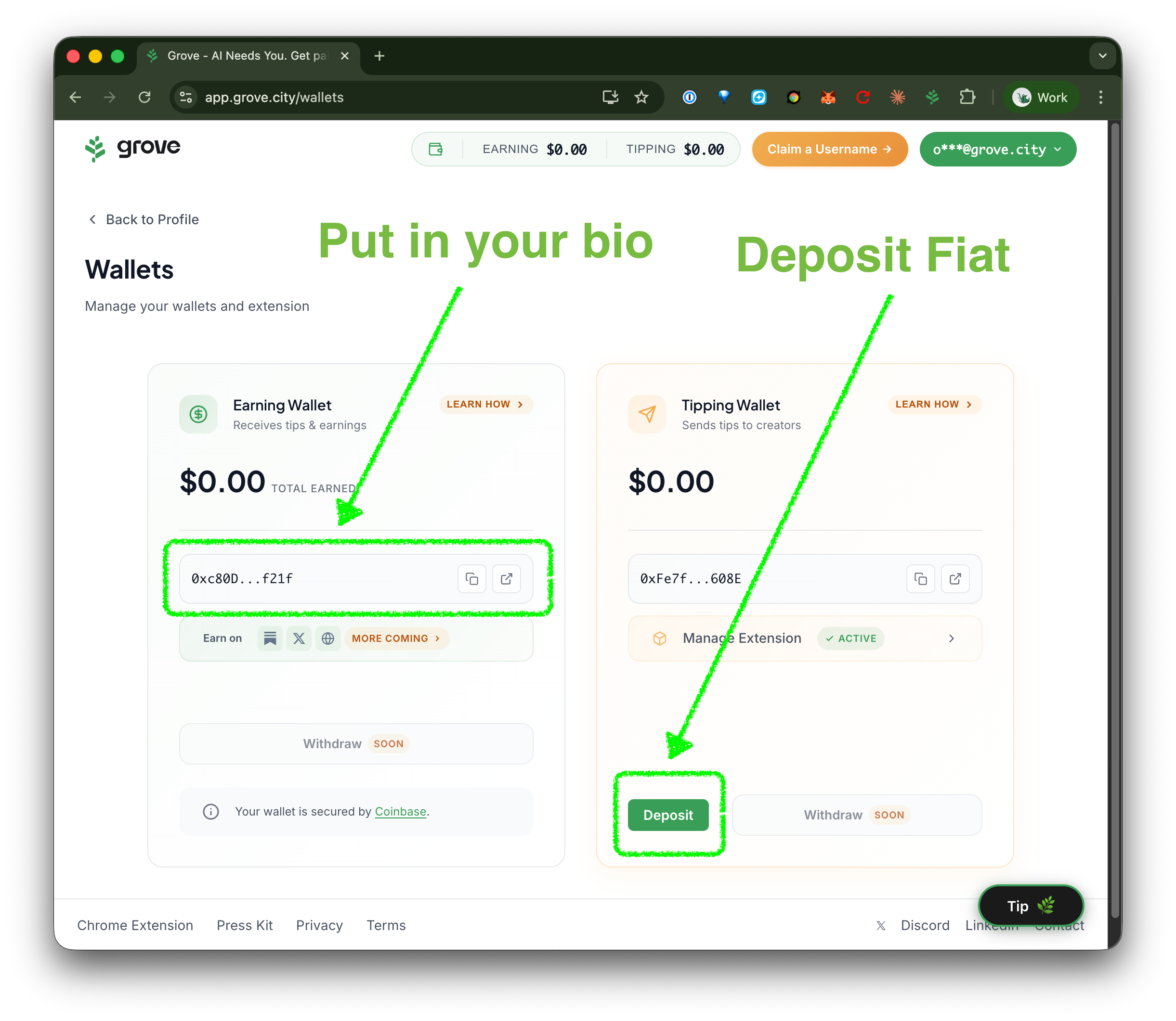 Just sign up using your email, head over to your profile, and copy your earnings wallet. It uses CDPâs Embedded Wallet infrastructure, so it always ties back to your email.