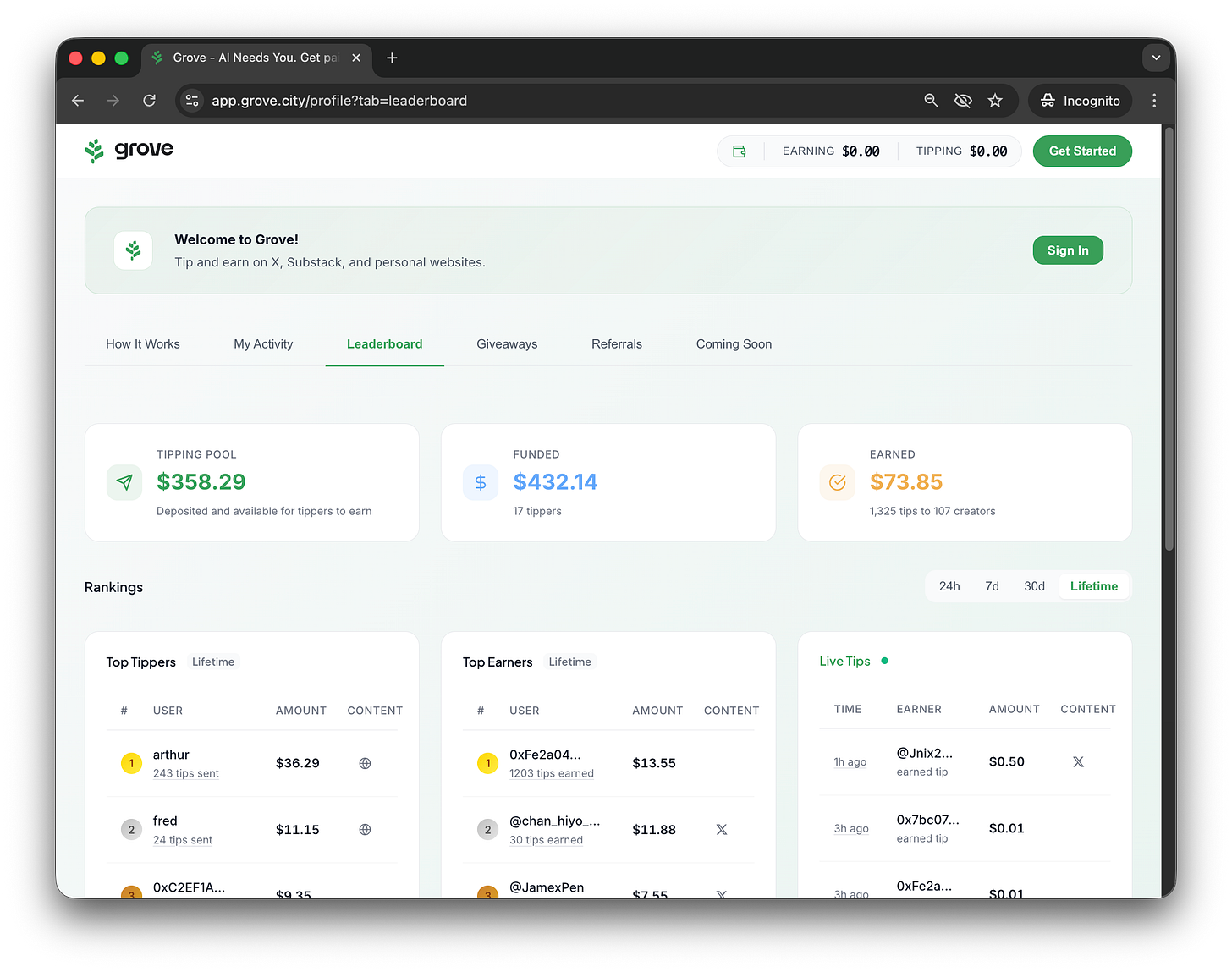 We have a leaderboard of all the tips being sent on our platform at app.grove.city, and weâre actively exploring what this unlocks: