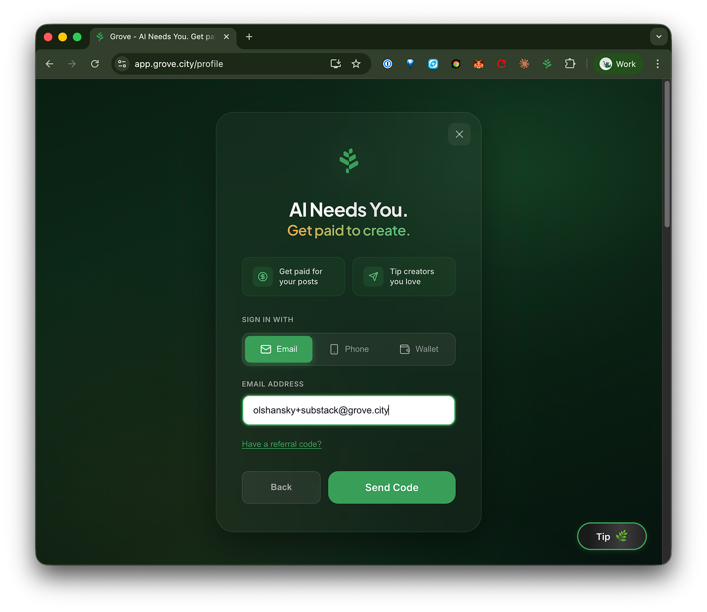 tl;dr Watch the 21-second video of how you can send a micro-payment on Substack, set up your account to start earning tips in a few minutes by signing up via email, and learn more at grove.city đż