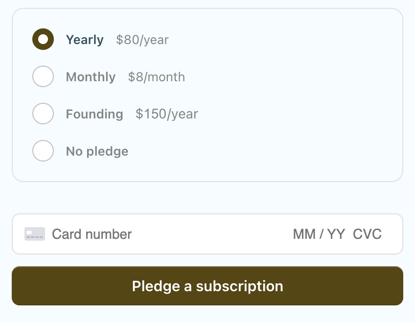 Right now, supporting a newsletter is expensive, requires a commitment, and forces you to think twice every time you see this screen: