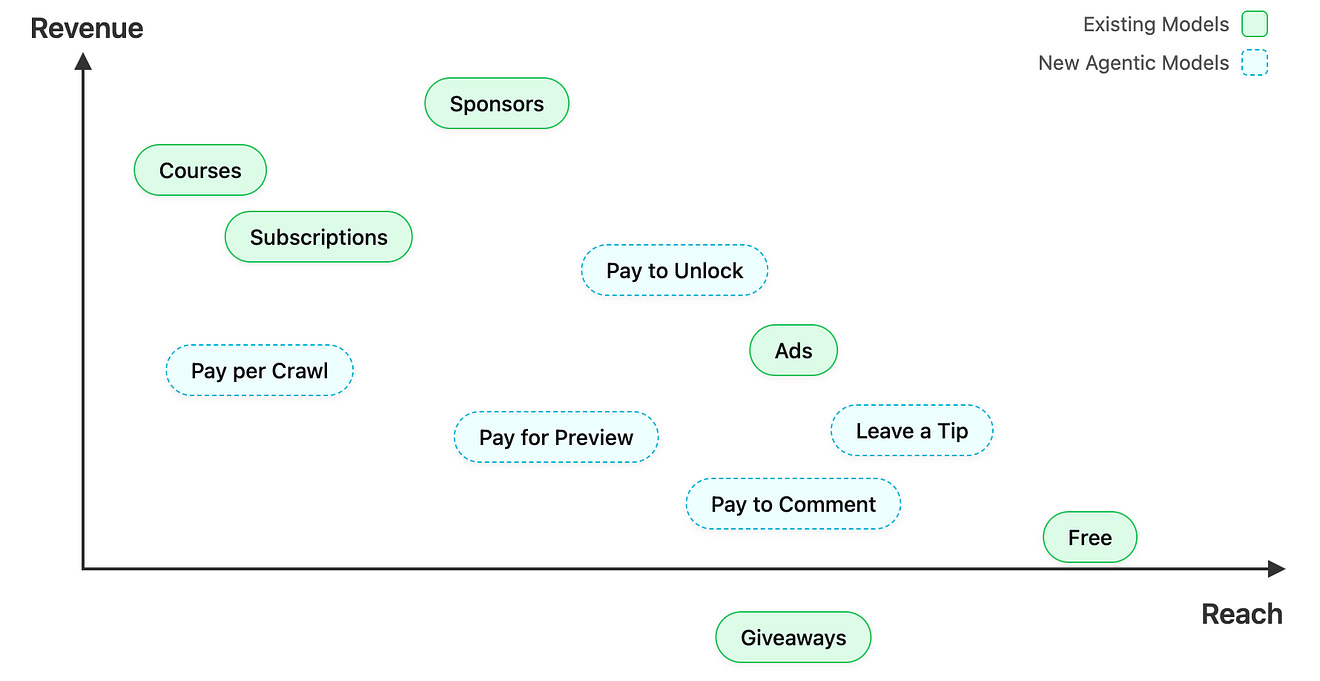 Here is the current landscape of business models on the Reach vs Revenue tradeoff matrix, including new models enabled by agentic payment infrastructure: