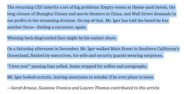 Disney has been a stable and solid business for decades. COVID was a wrinkle in time, Iger leaving was a curveball (or a boomerang if you will), with Disney plus helping raise the tide to keep the boat afloat.